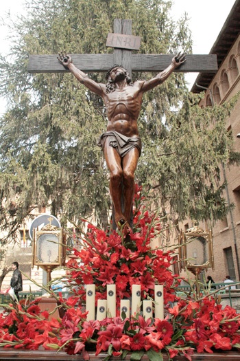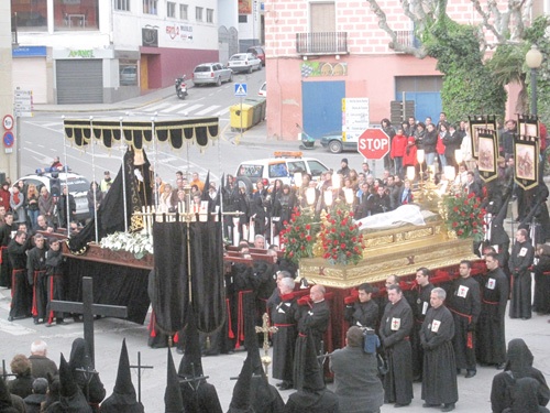 Pero es la Cofradía de la Vera Cruz, la que en 1619 organizó por primera vez la Procesión del Santo Entierro. El Prior de la misma, Pedro de Ruesta, viendo que la procesión de la Santísima Vera Cruz mermaba cada vez más tuvo la idea de, al igual que habían hecho en Zaragoza dos años antes, organizar una Procesión del Santo Entierro con mucha más participación que en las que hasta entonces se celebraban. Acabó por interesar a todo el pueblo en esta empresa; con él Marcos Gallarza y Domingo del Campo realizarían el Paso y la Imagen del Cristo yacente, los estandartes, la bandera y las demás insignias. Este acontecimiento supuso, con el paso del tiempo una unión de voluntades de todas las cofradías por mejorar cada vez má,s la procesión del Santo Entierro. Pero no siempre el ritmo fue creciente.